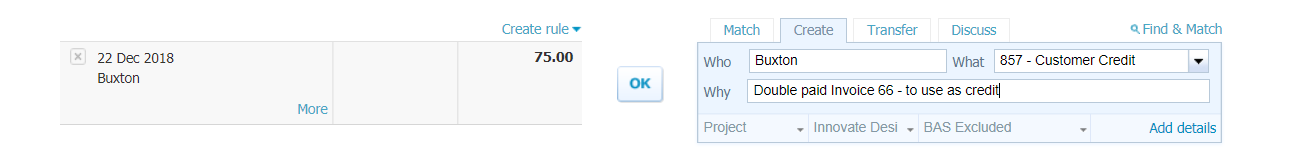 1. Cash Code the receipt in the Bank account to 857 - Customer Credit account with the Customer Name as the Contact.
