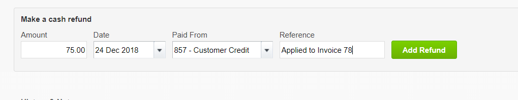 4. Go to the Credit Note and use the "Make a Cash Refund" feature to mark the customer credit used to the 857 - Customer Credit account. In the reference, add the invoice that the credit was applied to. Be careful if not all of the credit was used to only reduce the Amount by the correct value.